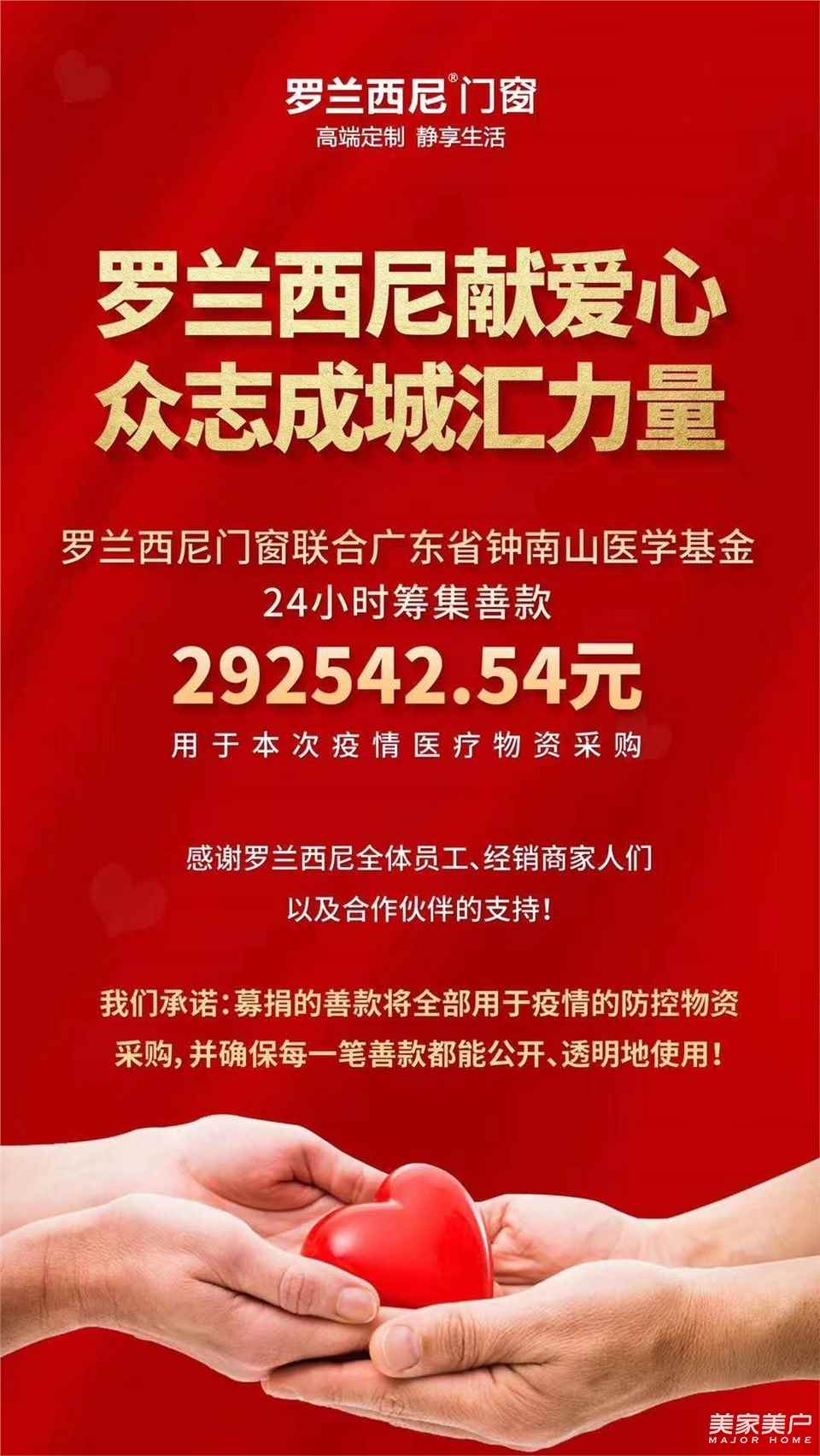 近日,羅蘭西尼門窗在全體員工、經銷商及合作伙伴的支持下,聯合廣東省鐘南山醫學基金24小時籌集善款292542.54元,募捐的善款將全部用于疫情的防控物資采購。