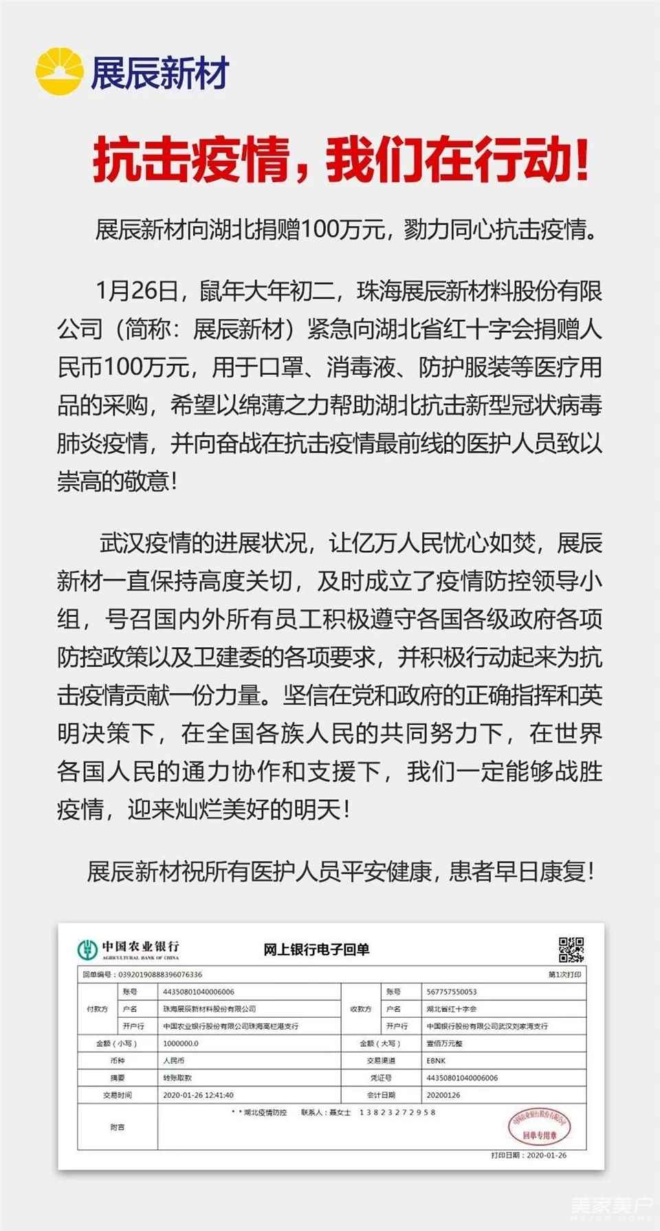 1月26日,珠海展辰新材料股份有限公司(簡稱:展辰新材)緊急向湖北省紅十字會捐贈100萬元,用于口罩、消毒液、防護服裝等醫療用品的采購。