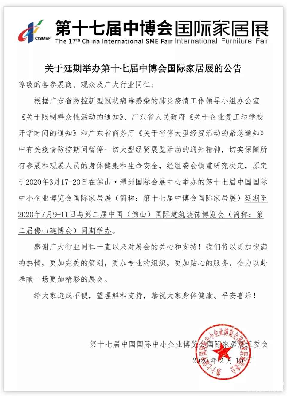 根據(jù)廣東省防控新型冠狀病毒感染的肺炎疫情工作領(lǐng)導(dǎo)小組辦公室《關(guān)于限制群眾性活動的通知》、廣東省人民政府《關(guān)于企業(yè)復(fù)工和學(xué)校開學(xué)時(shí)間的通知》和廣東省商務(wù)廳《關(guān)于暫停大型經(jīng)貿(mào)活動的緊急通知》中有關(guān)疫情防控期間暫停一切大型經(jīng)貿(mào)展覽活動的通知精神,切實(shí)保障所有參展和觀展人員的身體健康和生命安全,經(jīng)組委會慎重研究決定,原定于2020年3月17-20日在佛山·潭洲國際會展中心舉辦的第十七屆中國國際中小企業(yè)博覽會國際家居展(簡稱:第十七屆中博會國際家居展)延期至2020年7月9-11日與第二屆中國(佛山)國際建筑裝飾博覽會(簡稱:第二屆佛山建博會)同期舉辦。
