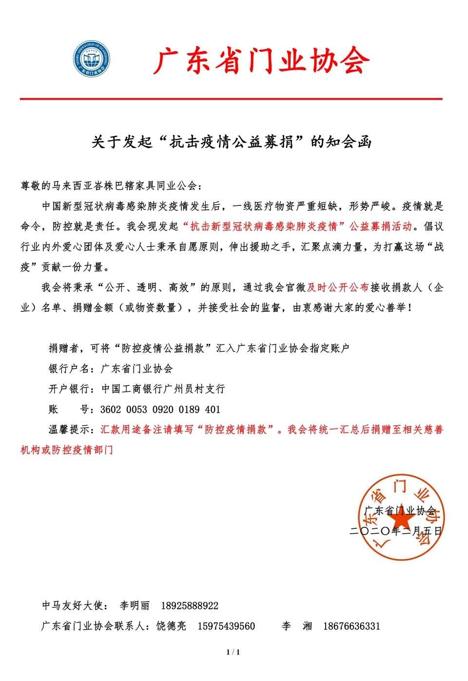 2月3日,自廣東省門業(yè)協(xié)會發(fā)起“抗擊新型冠狀病毒感染肺炎疫情”募捐活動后,不但得到會員企業(yè)的積極響應(yīng),紛紛籌集善款募捐;同時,此次募捐活動也得到廣東省門業(yè)協(xié)會國際友好協(xié)會—馬來西亞峇株巴轄家具同業(yè)公會積極響應(yīng)與援助,為此次抗擊疫情募捐善款5000元,由廣東省門業(yè)協(xié)會代為捐助。馬來西亞峇株巴轄家具同業(yè)公會此次募捐,得到業(yè)界同仁的廣泛關(guān)注與贊賞。 在此次募捐中,廣東省門業(yè)協(xié)會會員企業(yè)與馬來西亞峇株巴轄家具同業(yè)公會共募集善款20多萬元(不含會員企業(yè)自行安排援助的捐助抗疫物資),并采購到醫(yī)護物資在第一時間送往湖北抗疫物資急需援助醫(yī)院。在此,我們對馬來西亞峇株巴轄家具同業(yè)公會的大愛之舉表示衷心的感謝。