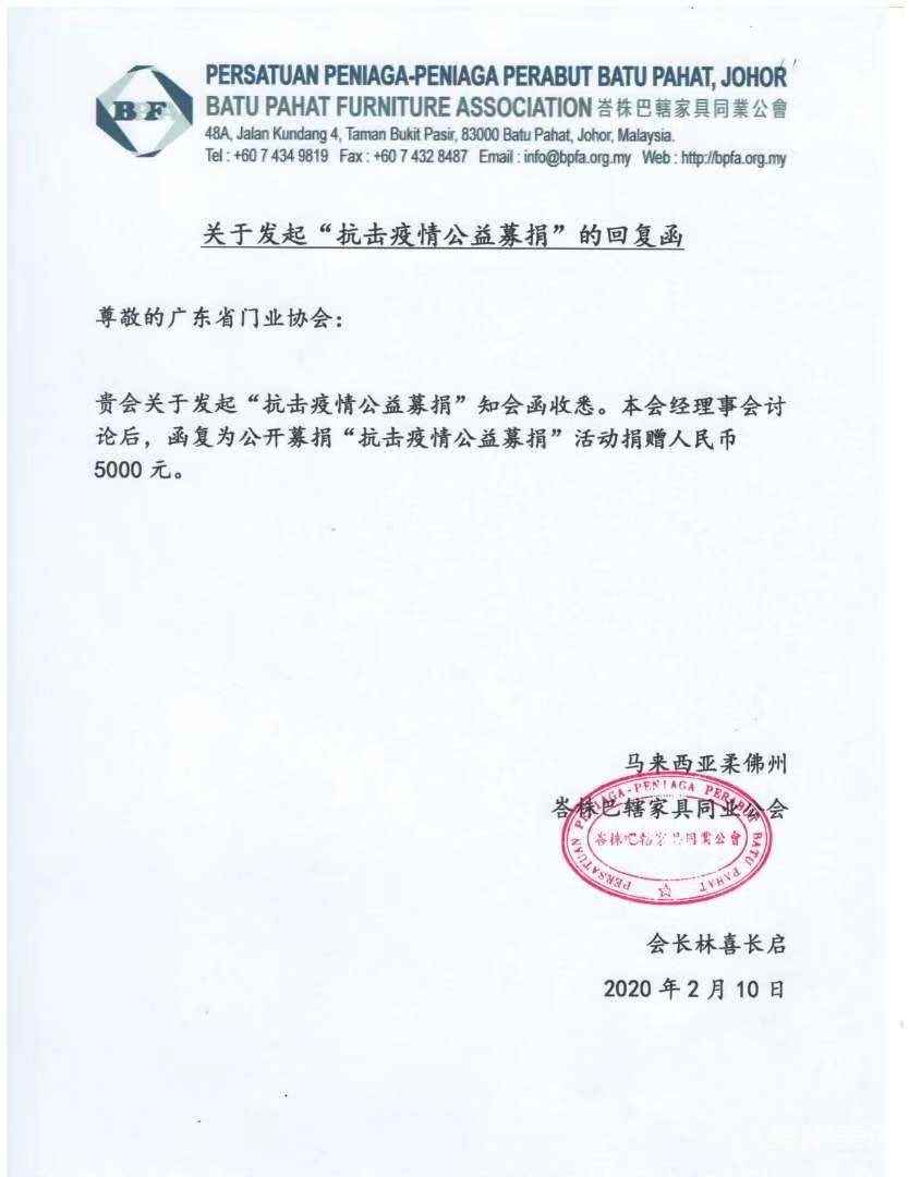 馬來西亞峇株巴轄家具同業(yè)公會助力中國“抗疫”,攜手廣東門協(xié)馳援湖北醫(yī)護一線