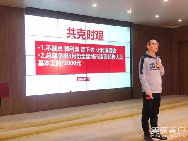 縱瑞原明確表示,TATA木門把2020年利潤目標調整為“零”, 將與所有分公司和代理商們共克時艱,做出兩項決策:1、不裁員,降利潤,活下去,讓利消費者;2、總部承擔3月份全國城市店面銷售人員基本工資。