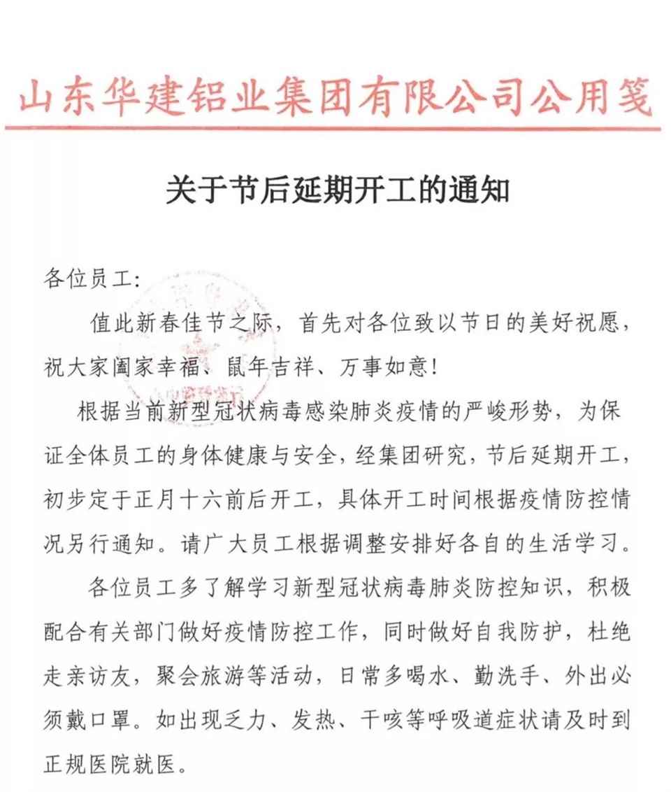 根據當前新型冠狀病毒感染肺炎疫情的嚴峻形勢,為堅決貫徹落實上級黨委政府疫情防控工作部署要求,保證集團全體員工的生命安全和身體健康,集團于2020年1月30日和2月7日,分別發布《關于節后延期開工的通知》和《關于繼續推遲開工時間的通知》,推延復工時間,要求公司員工居家做好自我防護,杜絕走親訪友、聚會旅游等情況,堅決切斷疫情大范圍傳播途徑。