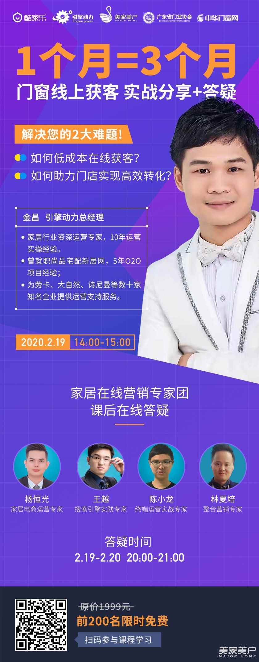 基于此,酷家樂攜手引擎動力、廣東門業協會、美家美戶、中華門窗網,針對門窗企業及門店經營者面臨的營銷困境,重磅推出“門窗線上獲客實戰分享”公益課程,為行業提供線上營銷新思路,判斷線上獲客新方向,助力終端在線談單、高效轉化,快速實現業績提升!