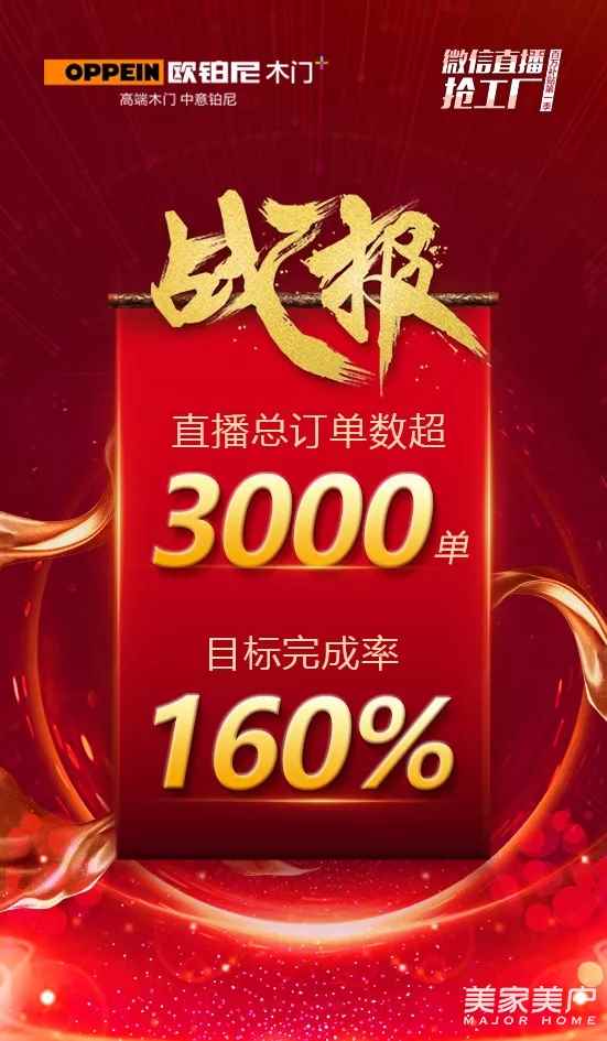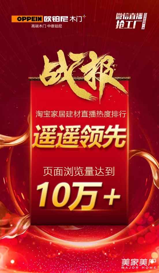 在多渠道聯合發力下,歐鉑尼微信直播搶工廠·百萬補貼第一季活動在當天交出了一份目標完成率高達160%的滿意答卷。淘寶家居建材直播熱度排行遙遙領先,頁面瀏覽量達到100000+。