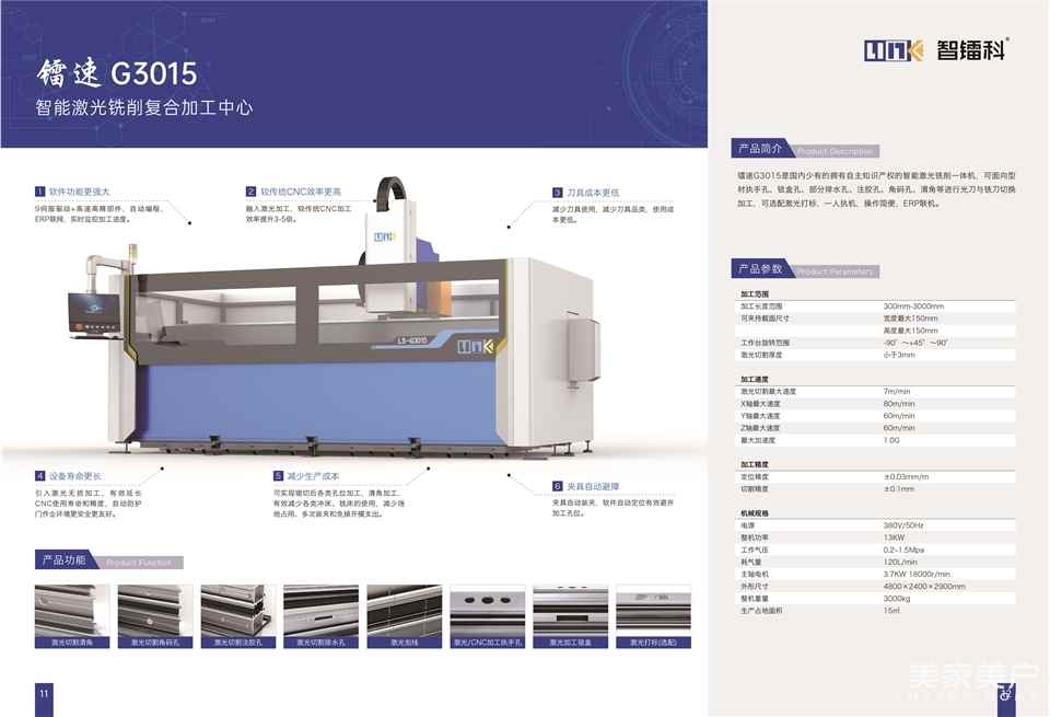 該設備的軟件功能更強大,較傳統CNC效率更高,刀具成本更低,設備壽命更長,減少生產成本,還可實現夾具自動避障。 產品功能:激光切割清角;激光切割角碼孔;激光切割注膠孔;激光切割排水孔;激光劃線;激光、CNC加工執手孔;激光加工鎖盒;激光打標(選配)。