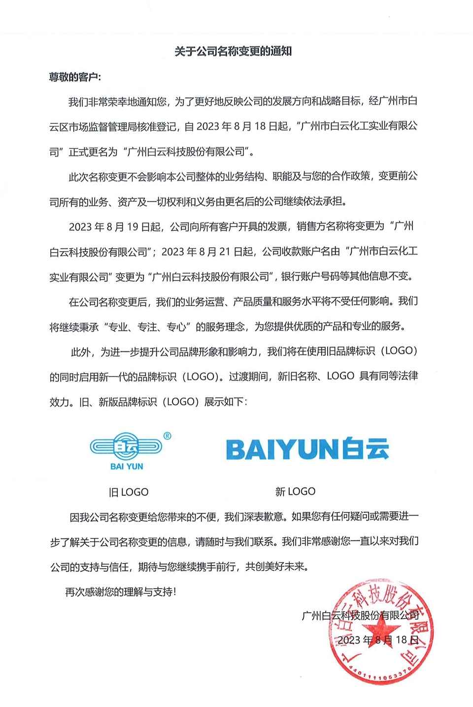 我們非常榮幸地通知您,為了更好地反映公司的發展方向和戰略目標,經廣州市白云區市場監督管理局核準登記,自2023年8月18日起,“廣州市白云化工實業有限公司”正式更名為“廣州白云科技股份有限公司”。
