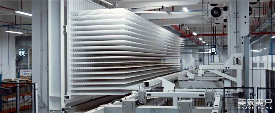 五期工廠借鑒了很多跨行業(yè)的先進經(jīng)驗,采用前沿新技術,顛覆了一些傳統(tǒng)的做法。例如分揀系統(tǒng)通常設置在排孔之后和包裝之前,在頂固五期工廠中,這一步驟安排在封邊后面。同時,每個生產(chǎn)環(huán)節(jié)都設有自動緩存設備,不僅有效平衡了上下工序間的產(chǎn)能瓶頸,更將柔性化生產(chǎn)能力發(fā)揮到極致。