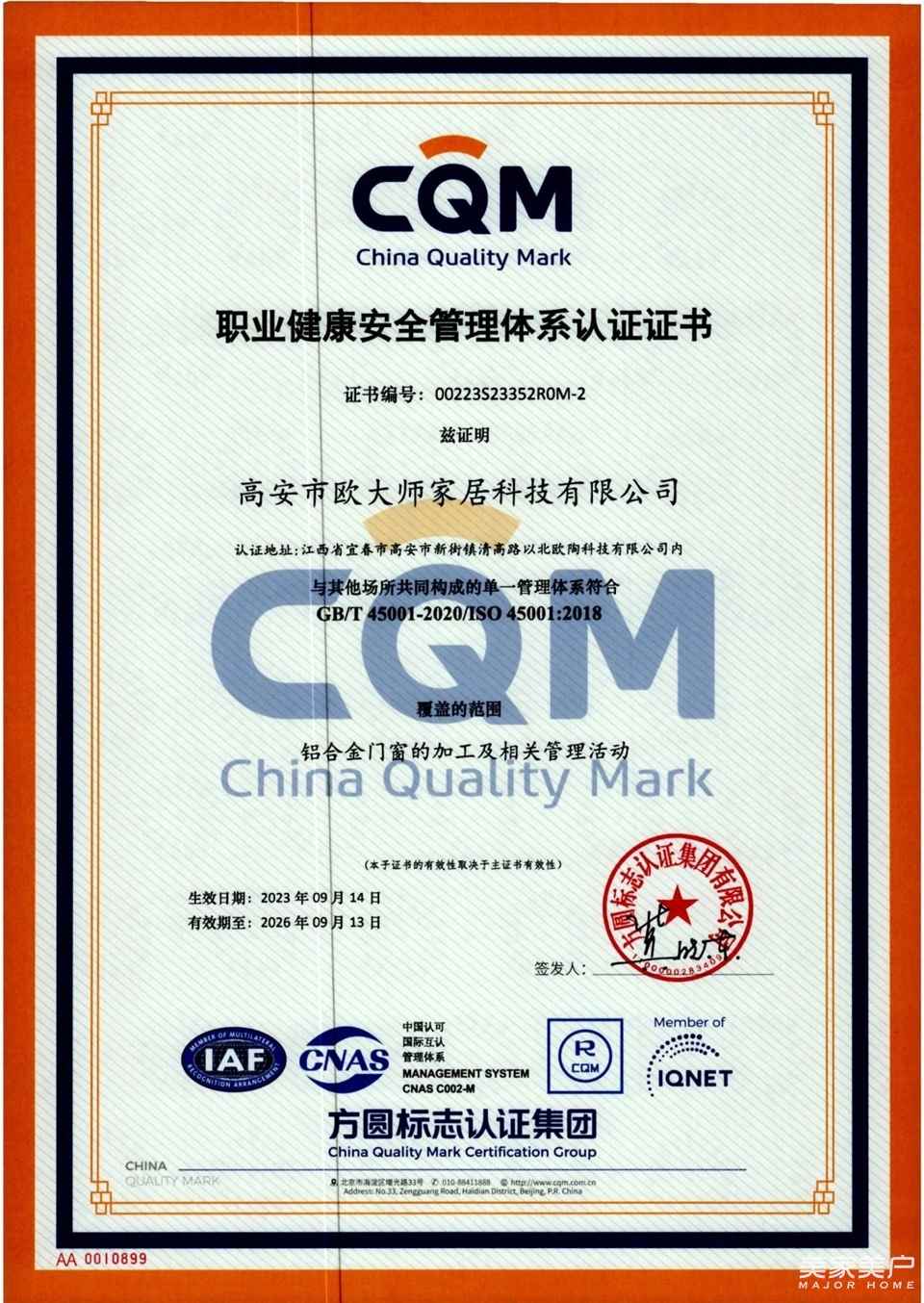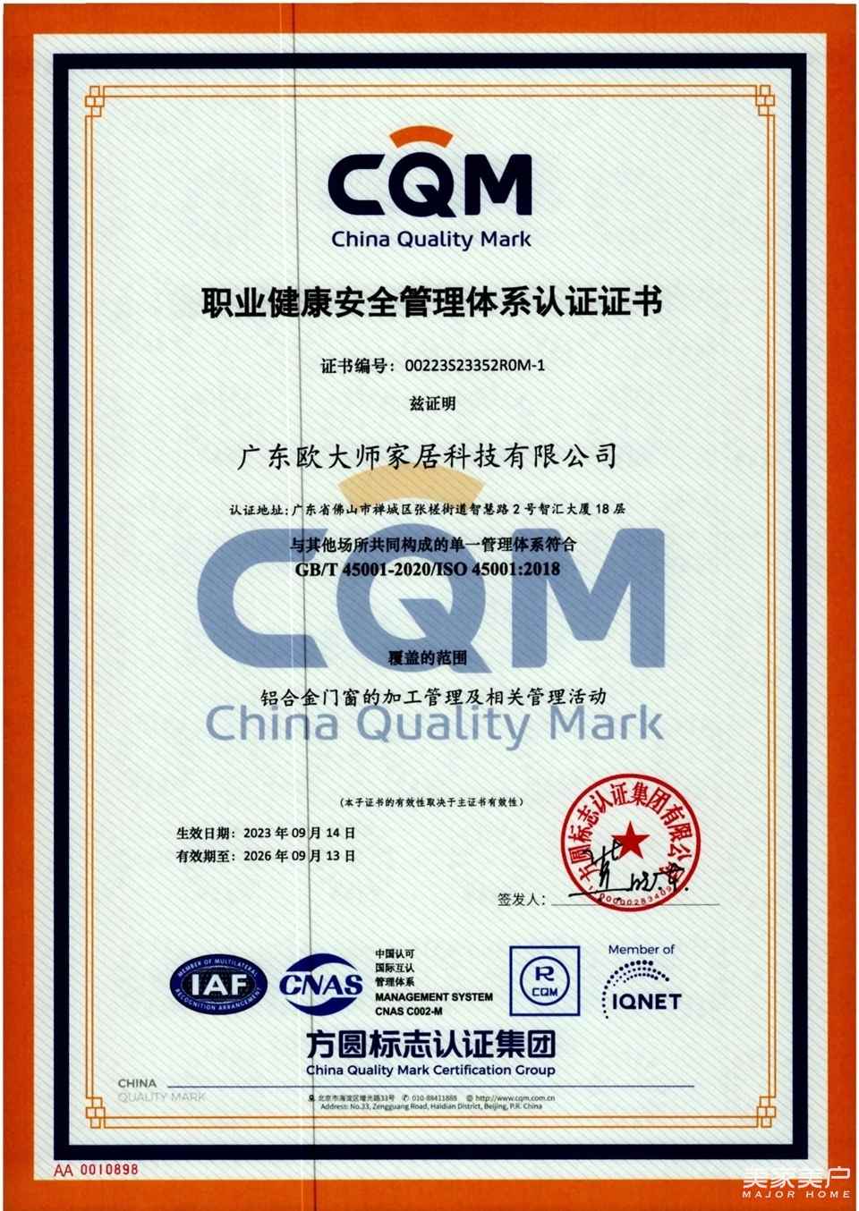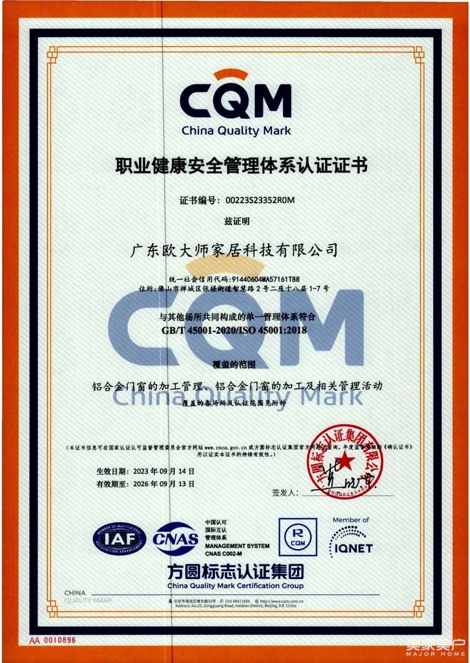 喜訊不斷、捷報頻傳。經國家權威機構的認證與審核,近日歐大師隔熱門窗順利通過ISO9001質量管理體系、ISO14001環境管理體系、ISO45001職業健康安全管理體系三大認證,取得《質量管理體系認證證書》《環境管理體系認證證書》《職業健康安全管理體系認證證書》;