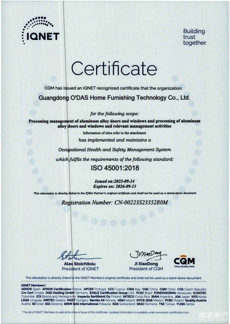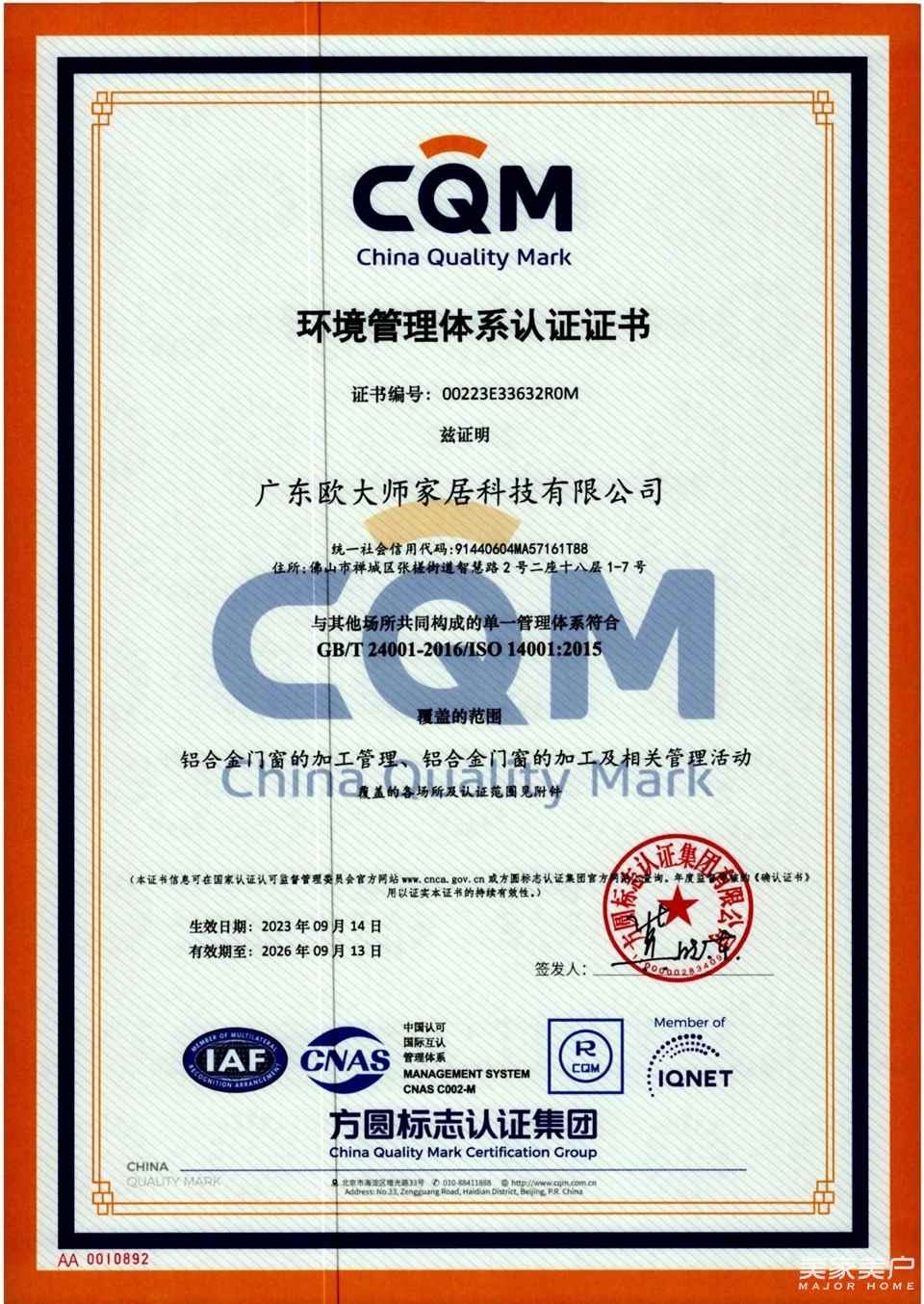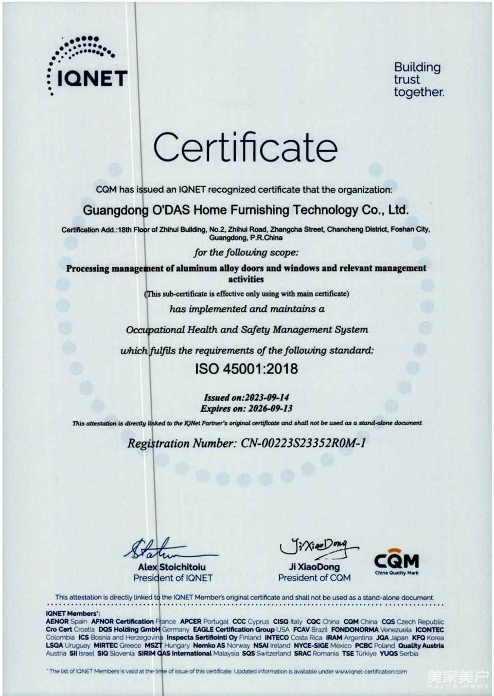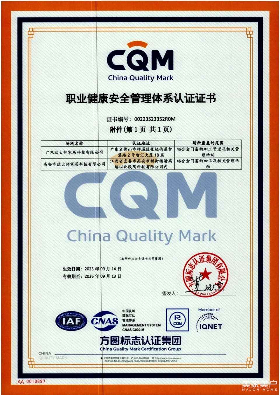 喜訊不斷、捷報頻傳。經國家權威機構的認證與審核,近日歐大師隔熱門窗順利通過ISO9001質量管理體系、ISO14001環境管理體系、ISO45001職業健康安全管理體系三大認證,取得《質量管理體系認證證書》《環境管理體系認證證書》《職業健康安全管理體系認證證書》;