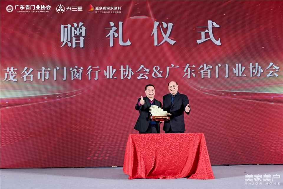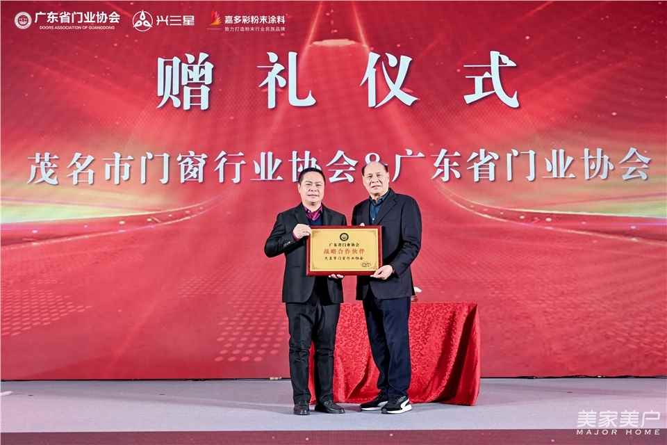 隨后,廣東省門業協會會長李鈞洪,分別為興三星云科技副總裁陳瑋琦、嘉多彩粉末涂料總經理李文岳,頒發了“總冠名”“分冠名”單位榮譽牌匾。