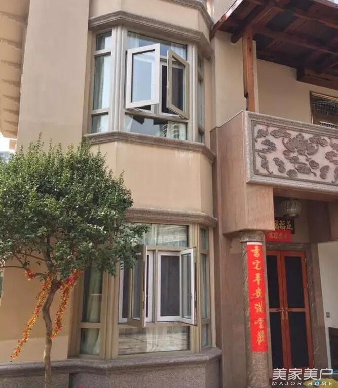 冠邦95系列轉角窗有迪拜砂金、北美金橡、南美花梨木、紅影酸枝等數十個顏色可選,任選雙色隨意搭配,內外雙色隨意搭配,可讓窗戶室內色彩與家裝風格相融合,業主簡歐風格家裝全屋家居色彩以淺色為主,為配合整體性,門窗均選了柔和浪漫的加州水曲柳色。