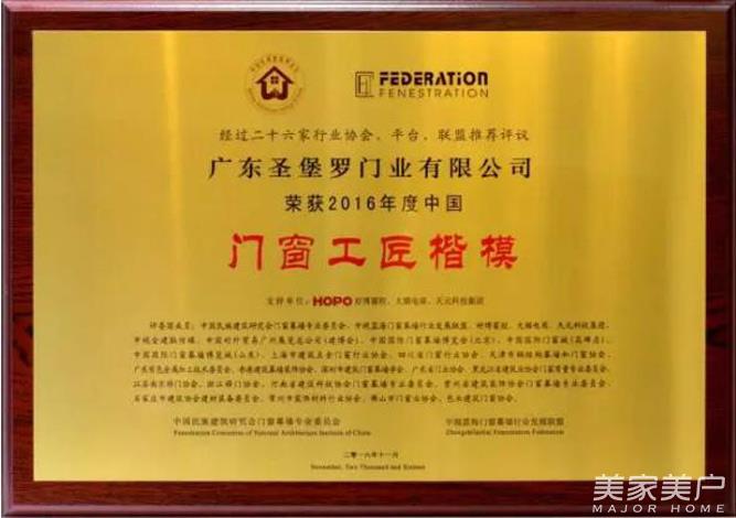 經(jīng)過評(píng)委推薦、專家審議,在“公平公正公開”的評(píng)選原則下,整體門窗十大品牌圣堡羅整體門窗以對(duì)“工匠精神”的深刻詮釋,對(duì)產(chǎn)品和服務(wù)精益求精的不懈追求,在眾多門窗品牌企業(yè)中脫穎而出,榮獲 2016 年度中國(guó)“門窗工匠楷模”榮譽(yù)稱號(hào)。