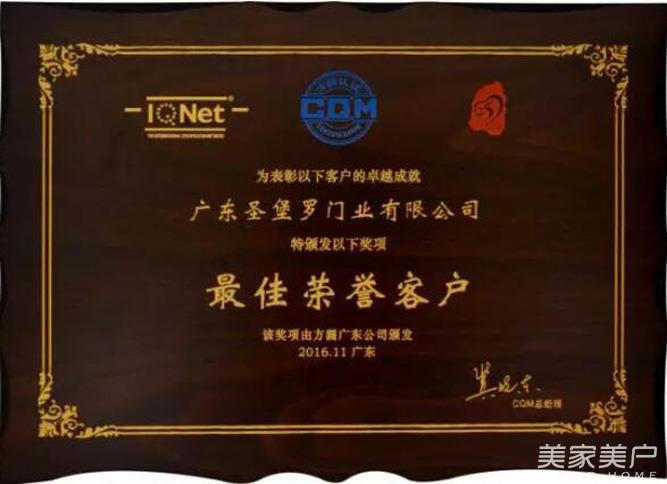 2016年11月11日,在方圓標(biāo)志認(rèn)證集團(tuán)公司召開的“2016年度最佳榮譽(yù)客戶頒獎(jiǎng)及交流大會(huì)”上,圣堡羅整體門窗也斬獲“最佳榮譽(yù)客戶”。