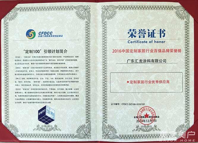 匯龍涂料被評為“定制家居行業(yè)優(yōu)秀供應(yīng)商”