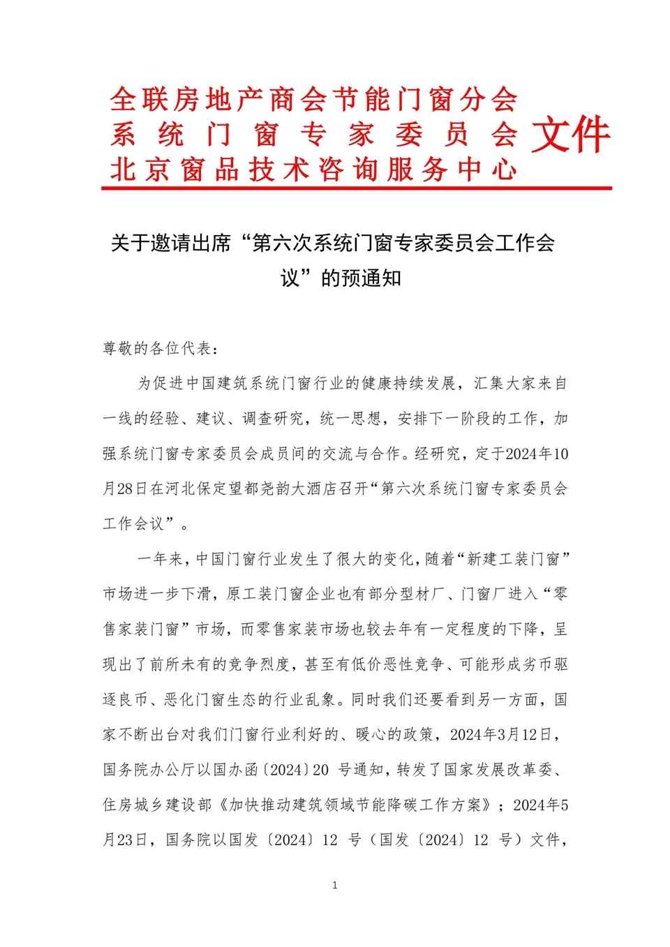關于邀請出席“第六次系統(tǒng)門窗專家委員會工作會議”的預通知
