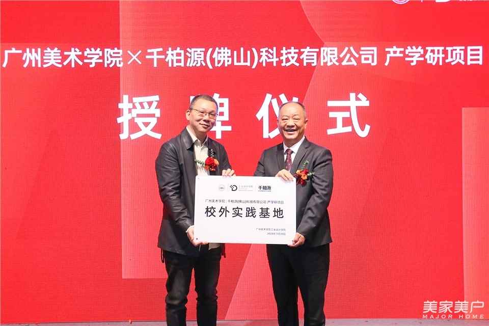 會(huì)議現(xiàn)場(chǎng),廣州美術(shù)學(xué)院與千柏源科技產(chǎn)學(xué)研項(xiàng)目舉行了隆重的剪彩儀式和授牌儀式。廣州美術(shù)學(xué)院工業(yè)設(shè)計(jì)學(xué)院副院長(zhǎng)王濤為廣東千柏源股份董事長(zhǎng)劉揚(yáng)北頒發(fā)“校外實(shí)踐基地”牌匾。