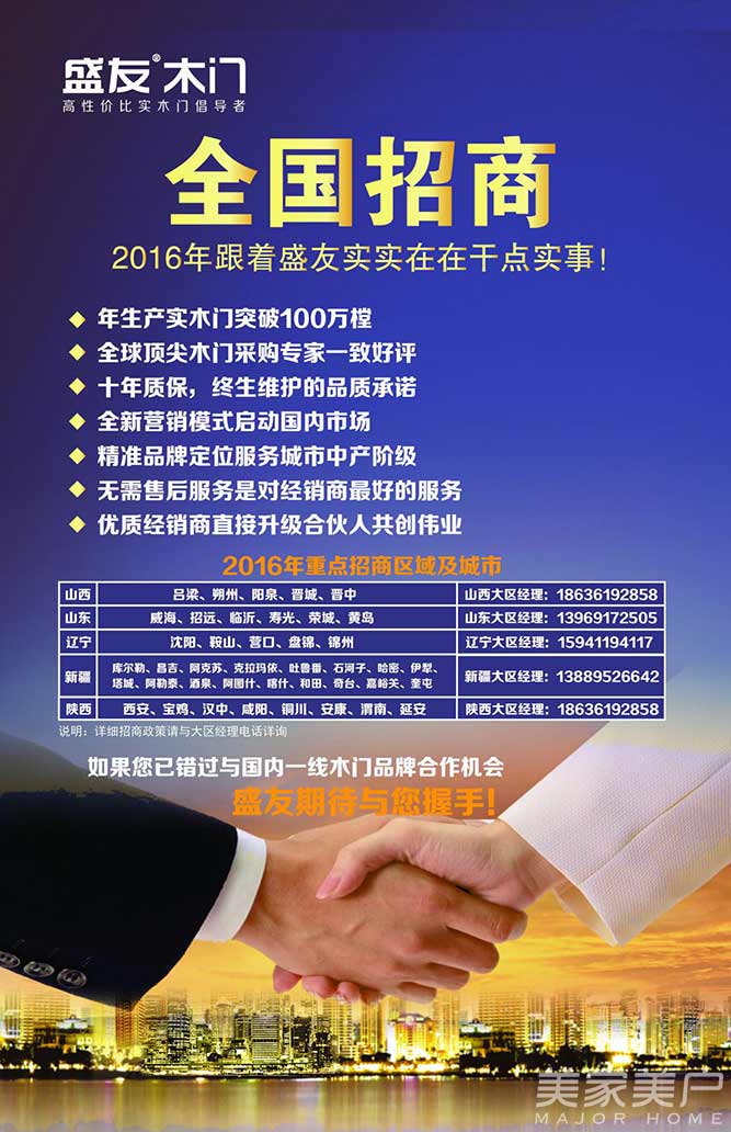 2016年,盛友木門品牌全國招商工作全面啟動(dòng),邀您共赴一場(chǎng)財(cái)富盛宴。