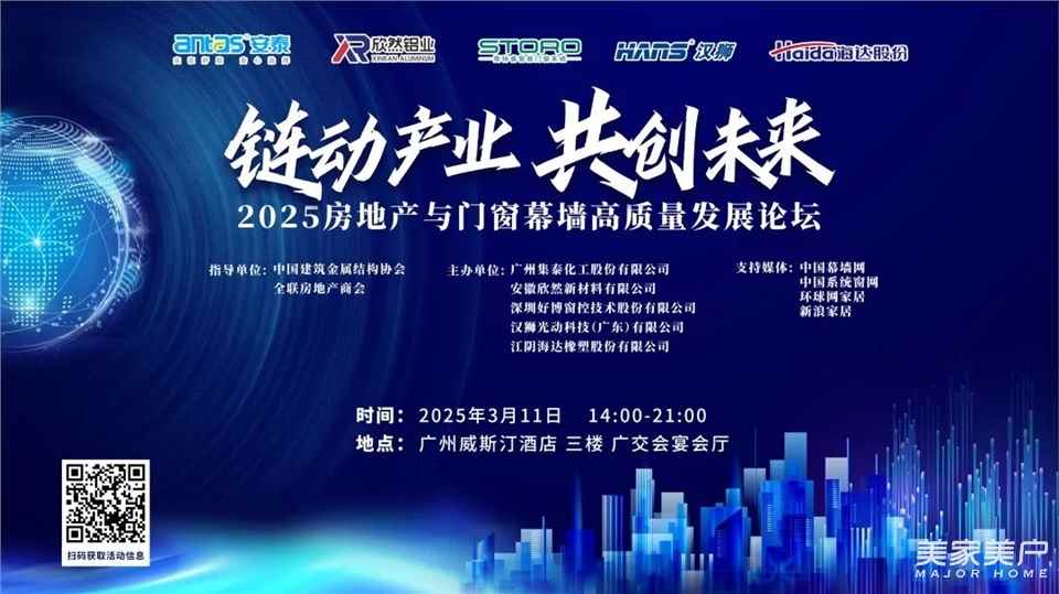 2025年3月11日,由中國建筑金屬結構協會、全聯房地產商會共同指導,廣州集泰化工股份有限公司(??安泰建筑膠)、安徽欣然新材料有限公司(??欣然鋁業)、深圳好博窗控技術股份有限公司(??斯特睿門窗)、漢獅光動科技(廣東)有限公司(??漢獅百葉)、江陰海達橡塑股份有限公司(??海達膠條)等五家“明星企業”聯合主辦的房地產與門窗幕墻高質量發展論壇,在廣州廣交會威斯汀酒店隆重召開。