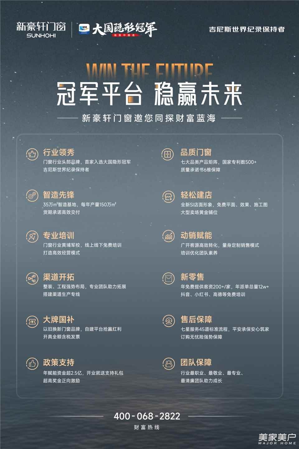 作為行業大國隱形冠軍,新豪軒擁有12大硬核優勢,賦能加盟商高速成長,助力加盟商鎖定先機,穩贏門窗賽道。歡迎更多創業者加入,共攀財富高峰!