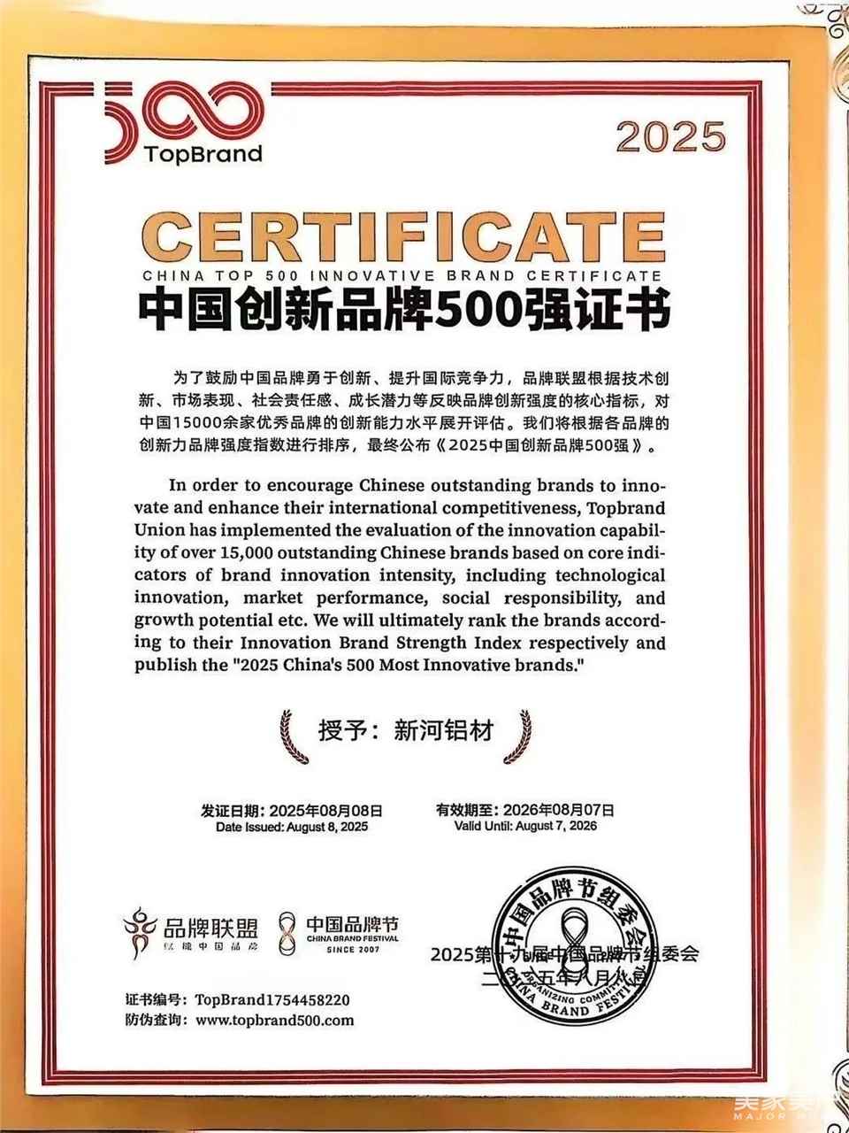 此次新河鋁材能從眾多優秀品牌中脫穎而出,既源于其在鋁材研發領域持續突破的技術創新 —— ??從綠色環保型材到高性能特種鋁材,每一項成果都彰顯著對行業前沿技術的深刻洞察。??更得益于其多年來以品質為基、以市場為導向的行業引領力,在推動鋁材產業升級、踐行可持續發展理念等方面的標桿實踐,早已成為行業內外的共識。