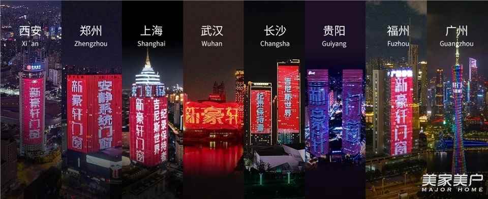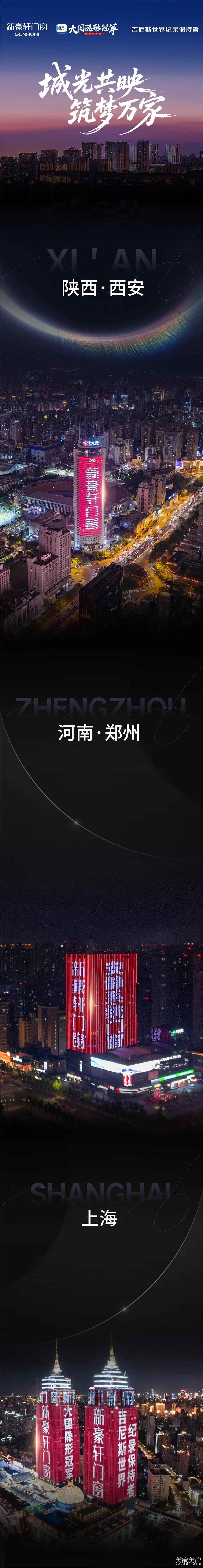品牌筑家日22周年慶即將來臨之際,新豪軒門窗攜「大國隱形冠軍」「吉尼斯世界紀錄保持者」等重磅榮譽,強勢登陸西安、鄭州、上海、武漢、長沙、貴陽、福州、廣州八城,同步點亮城市地標建筑,完成一場高頻共振的曝光盛宴,以具象化的品牌實力,傳遞一份關于“筑家”的溫暖承諾。