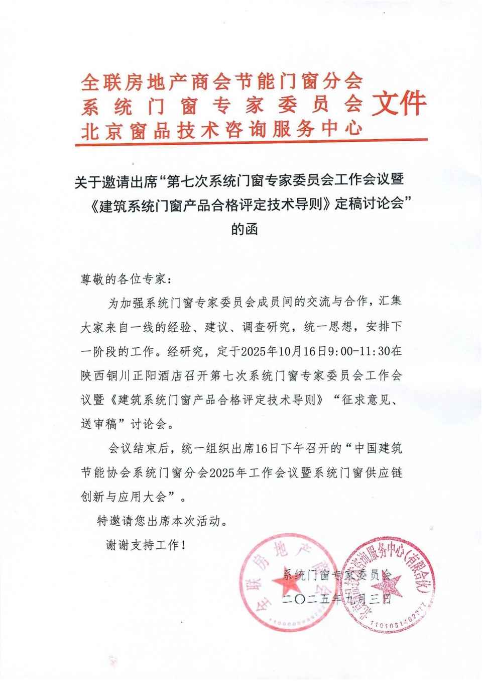 關(guān)于邀請(qǐng)出席“第七次系統(tǒng)門窗專家委員會(huì)工作會(huì)議”的函