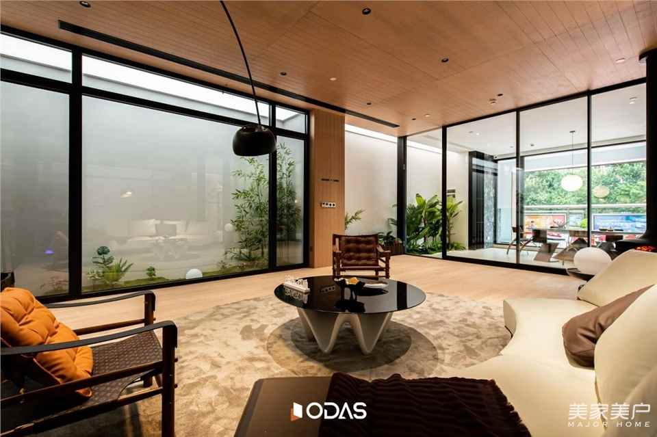 更為精妙的是,透過會客區(qū)的大玻璃向下俯瞰,能清晰瞧見一層峽谷的綠植與光影。上下兩層雖有著不同的高度與質(zhì)感,卻憑借天光與挑空設(shè)計緊密相連,讓自然與現(xiàn)代的融合感在此刻達到極致。