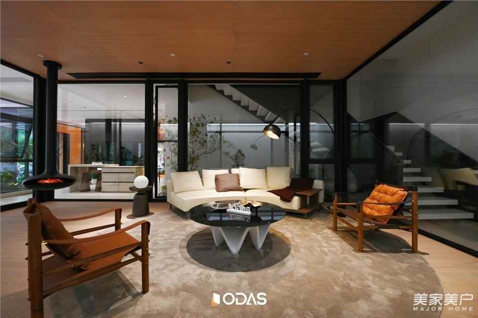 沿著原木樓梯拾級而上,空間氛圍在悄然間發(fā)生轉(zhuǎn)變。方才還置身于被木石、綠植環(huán)繞的“峽谷地脈”之中,此刻已緩緩步入滿是現(xiàn)代質(zhì)感的“云端閣樓”。這正是唐忠漢老師的匠心獨運之處:借一段樓梯,實現(xiàn)從“原始自然”到“精粹人文”的心理跨越,引領(lǐng)人們在行走間,自然過渡至精致生活的體驗維度。