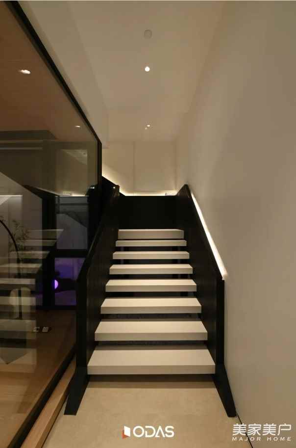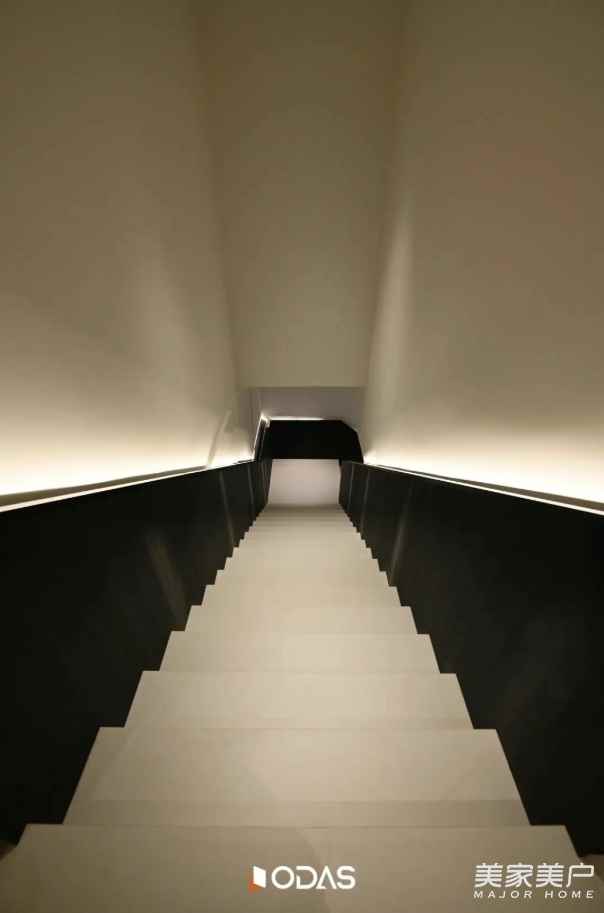 抵達樓梯盡頭的轉(zhuǎn)角,眼前這條通透的走廊,便是二層 “空中閣樓” 的序章。腳下與身旁的材質(zhì):不再是一層溫潤的原木與粗獷的石材,取而代之的是帶有細膩光澤的金屬線條、清透的玻璃與精密板材。