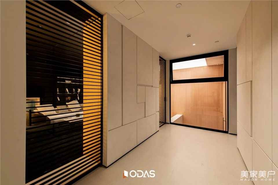 頂部的天光系統(tǒng)會隨著外界天色變化調(diào)整亮度,兩側(cè)墻面的側(cè)光與點狀射燈則巧妙藏在原木格柵后,光線透過格柵的縫隙灑下來,再經(jīng)過身旁門窗的玻璃折射,在地面、墻面形成斑駁流動的光影。光不僅把原木的肌理、石材的質(zhì)感雕琢得更有層次,更讓整個空間“活”了起來。