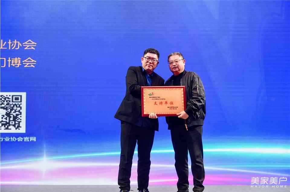 劉曉俊會長向重慶定制家博會頒發支持單位獎牌